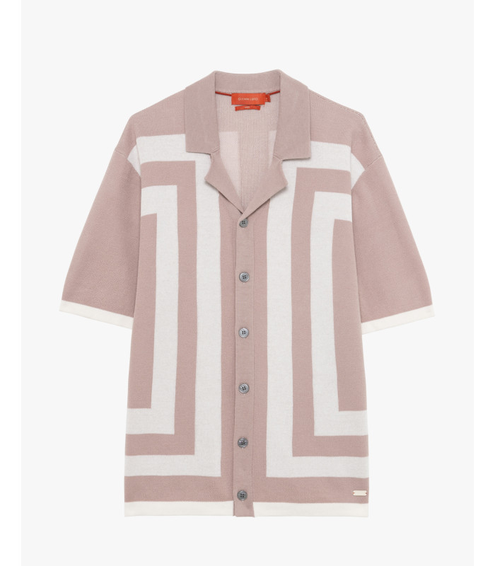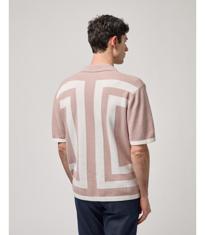 Mangas cortas – cuello abierto – cierre de botones frontales – punto compacto – patrón geométrico contrastante – dobladillo y bordes acanalados – parche con logo en el dobladillo