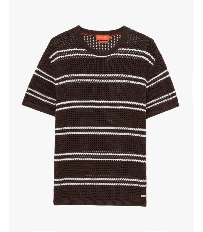 Cuello redondo – trabajo perforado – motivo a rayas contrastantes – mangas cortas – dobladillo acanalado – logo
