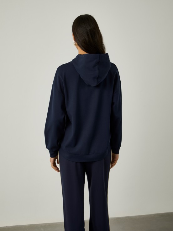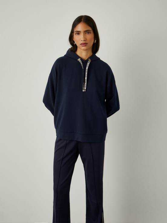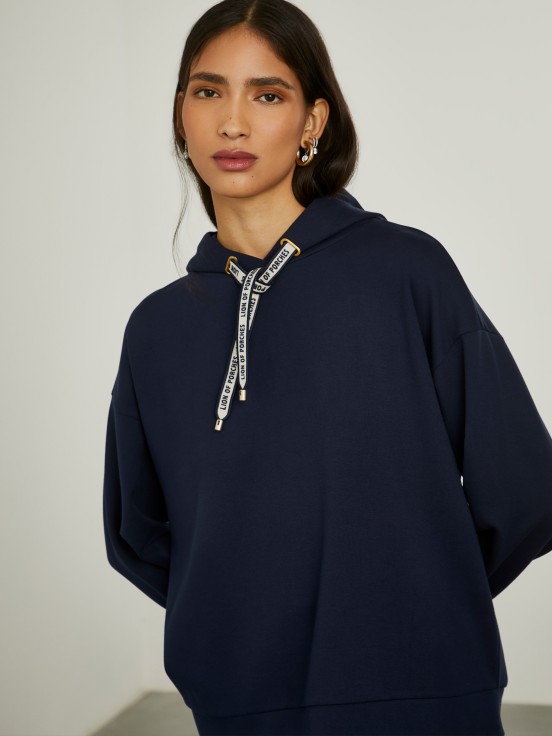 Para un look ligero y relajado, elija este suéter de manga larga con capucha ajustable con cordón y la marca Lion of Porches en color de contraste. Para un total look, mira también los pantalones de punto de la misma colección.