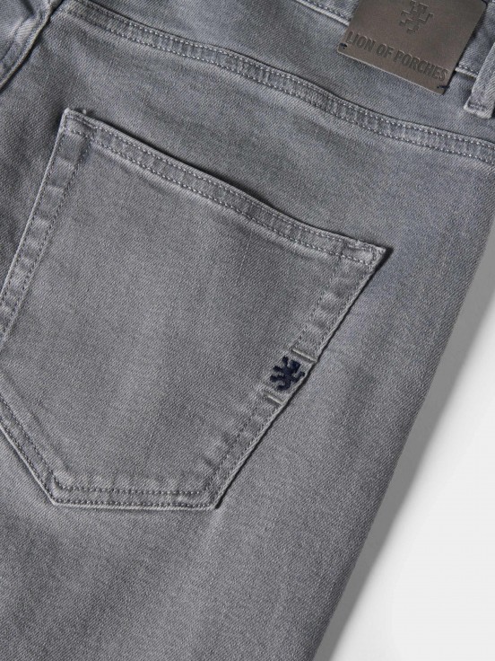 Pantalones de mezclilla de corte regular para una apariencia relajada. Se abrochan con botón y cremallera oculta por tapeta. Tienen cinco bolsillos: tres delanteros (uno pequeño para monedas) y dos traseros. Etiqueta del León de Porches en la parte trasera. Están confeccionadas en algodón y tienen un pequeño porcentaje de elastano para mayor comodidad. Detalle diferenciador de cinta tricolor en la base de la pierna para tapar la costura y doblar como se desee.