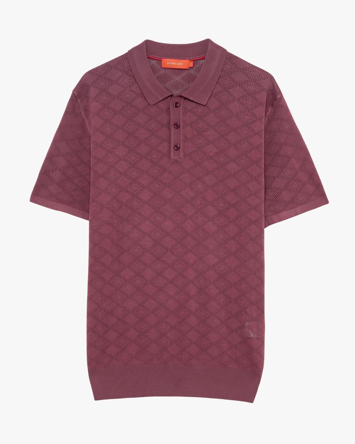 Cuello tipo polo – cierre de botones – mangas cortas – tela perforada con patrón de diamantes – dobladillo y mangas acanaladas
