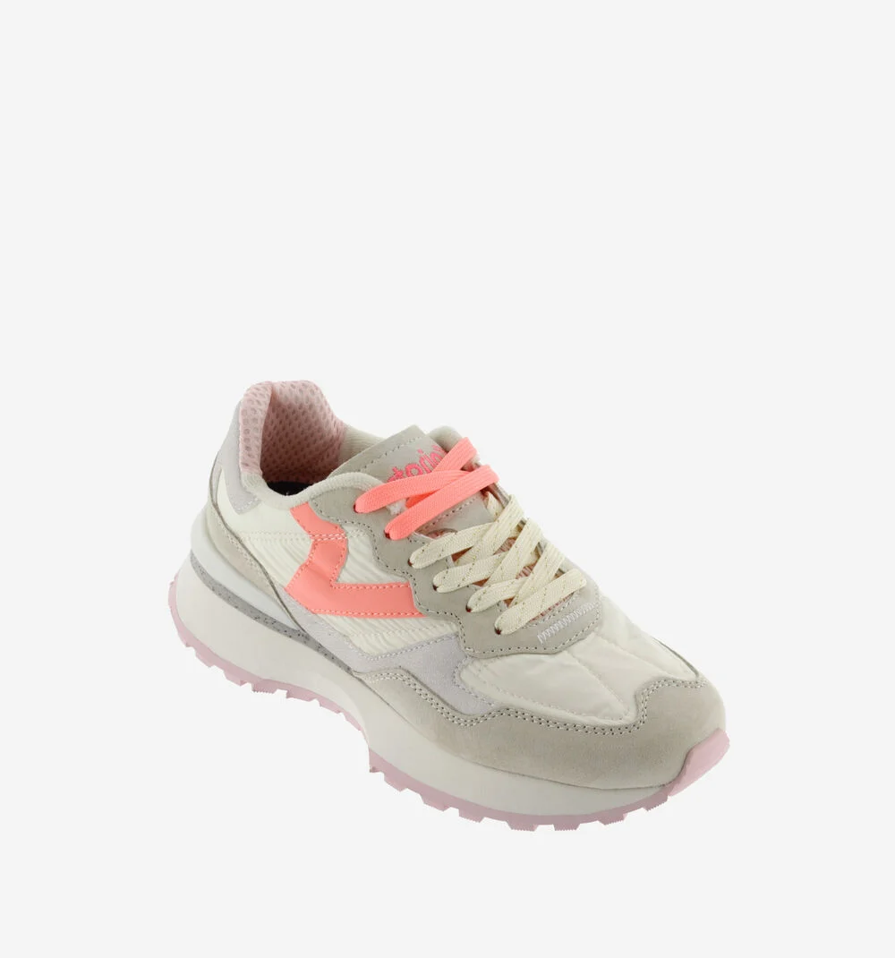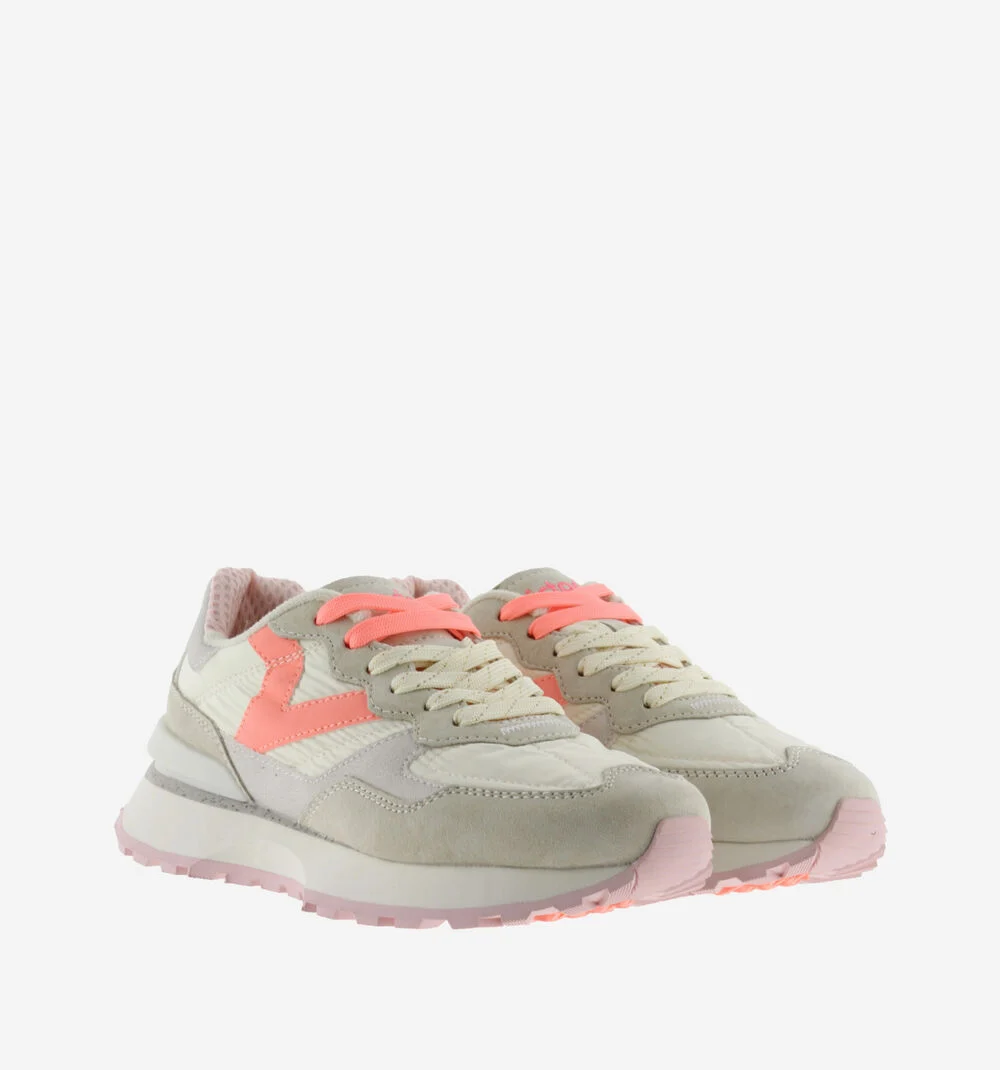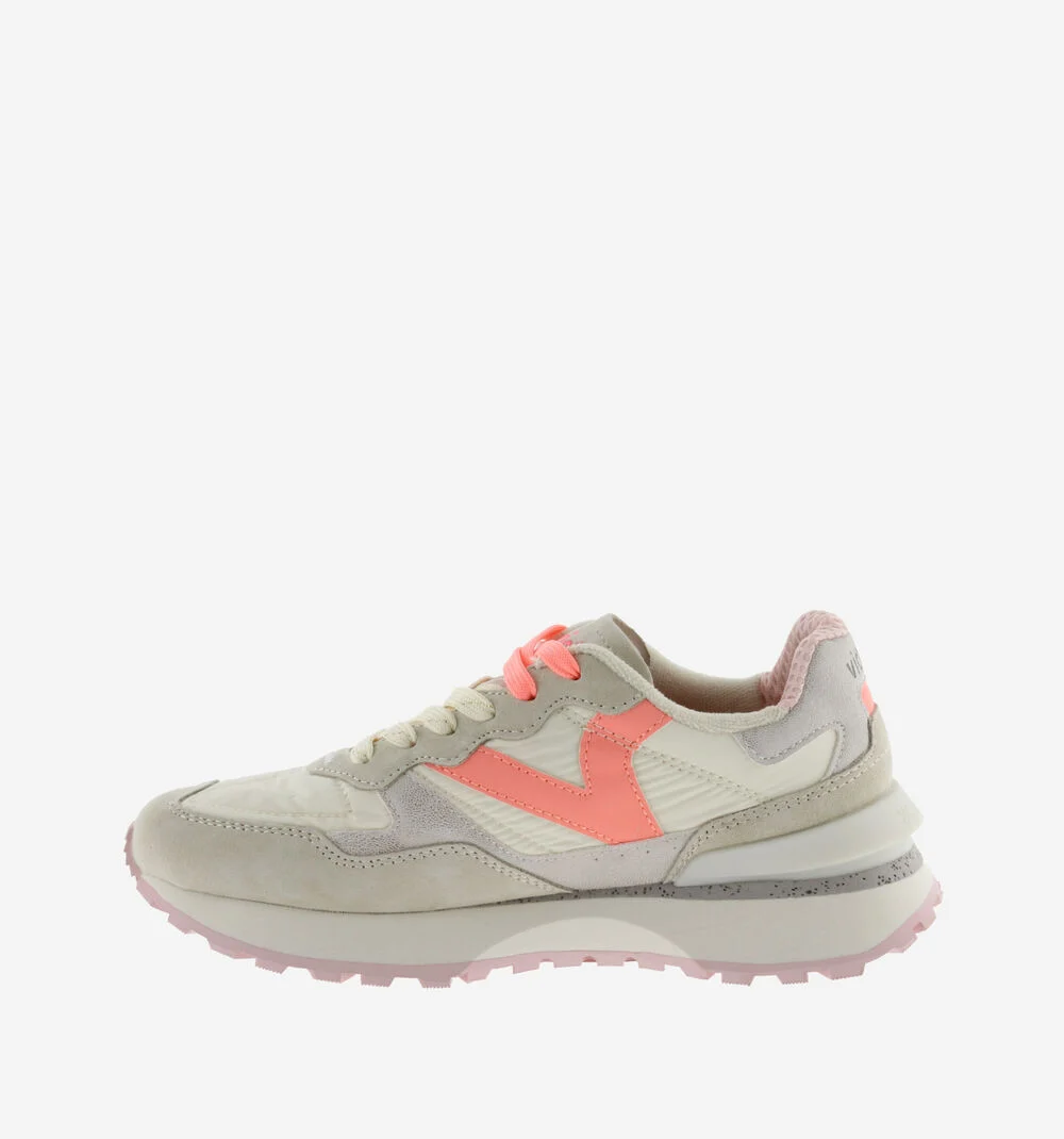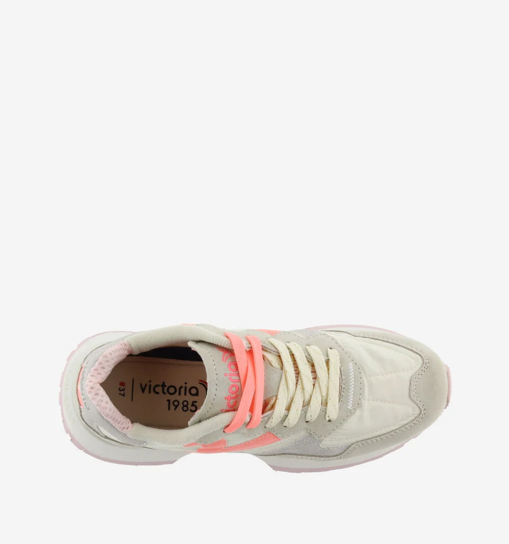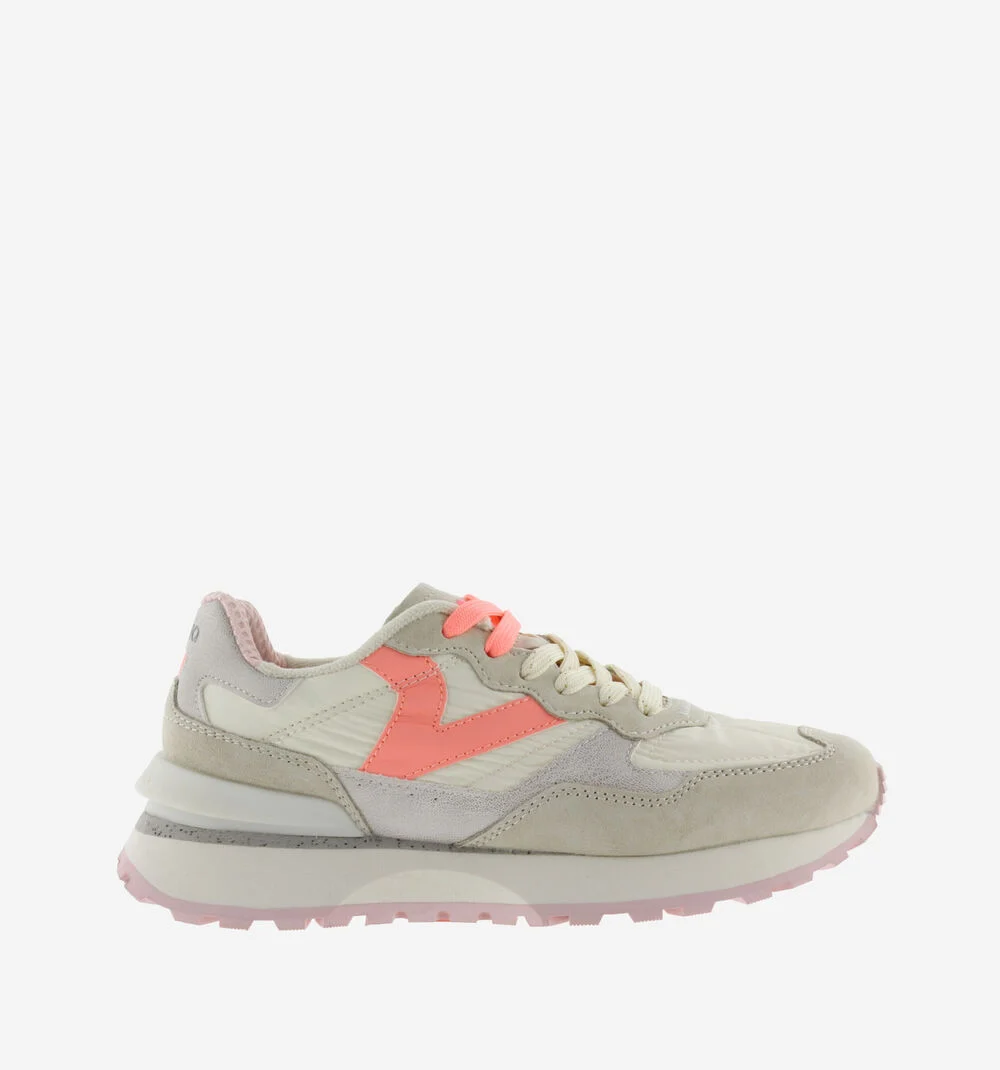 Sneakers para mujer confeccionadas en nylon fino «soft touch» con piezas superpuestas en serraje acabado «velour», y en microfibra metalizada. V retro de victoria en el lateral en PU «NEON». Cierre mediante cordones bicolor. Su suela bicolor de goma con base de caucho y diseño ergonómico garantiza un agarre óptimo en cualquier superficie, mientras que la plantilla con base de espuma proporciona una amortiguación ligera para una pisada confortable.