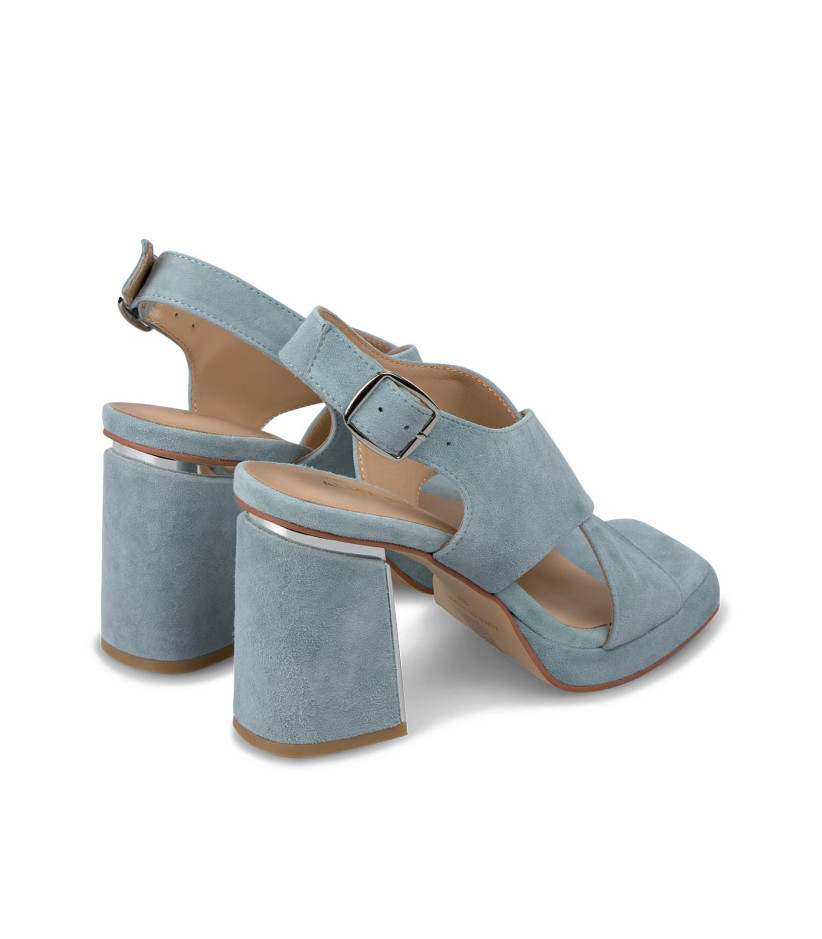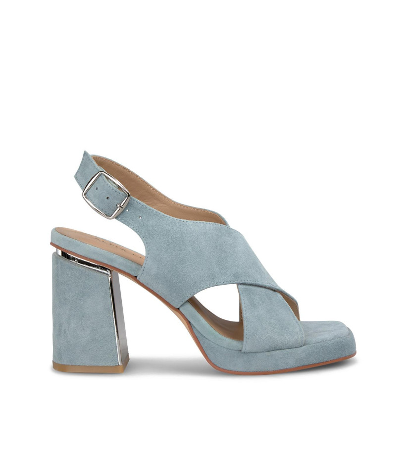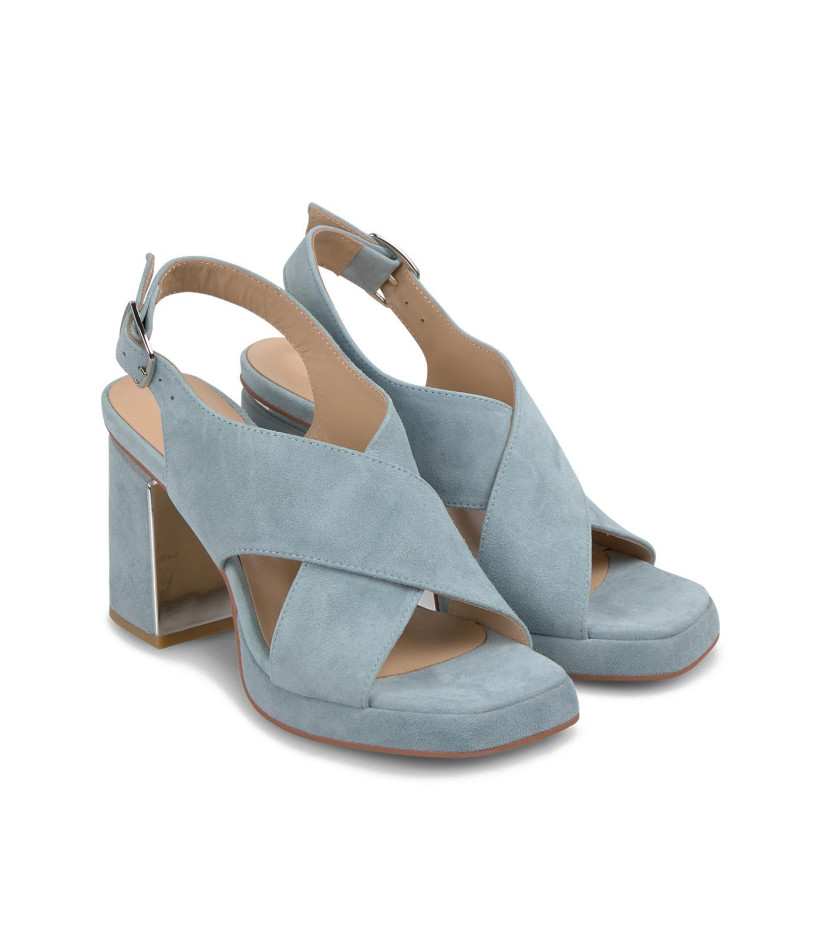 Sandalia tacón bloque con tiras cruzadas. Confeccionadas en piel. Con la puntera cuadrada. Cierre con hebilla y la altura del tacón es de 8,5cm.