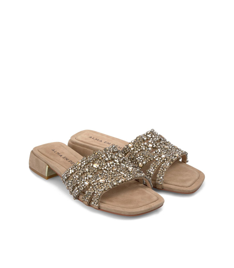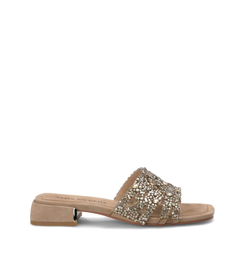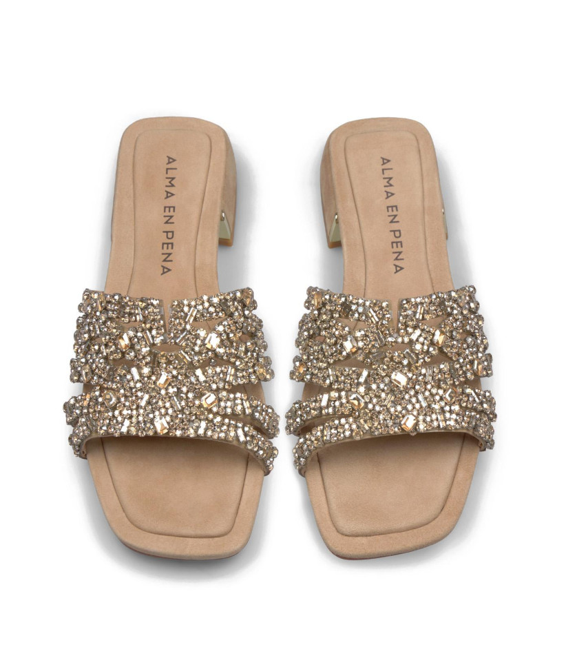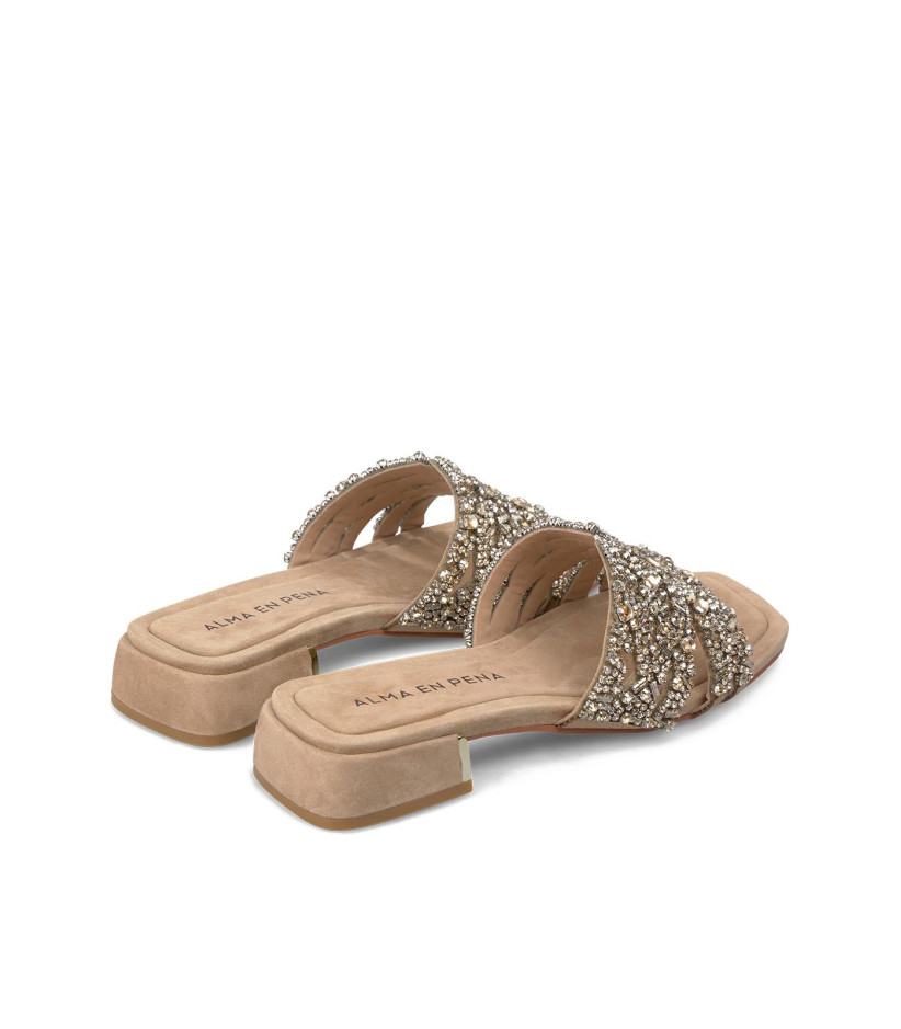 Sandalia plana con banda de pedrería y puntera cuadrada. Sin cierre y la altura del tacón es de 3,5cm.