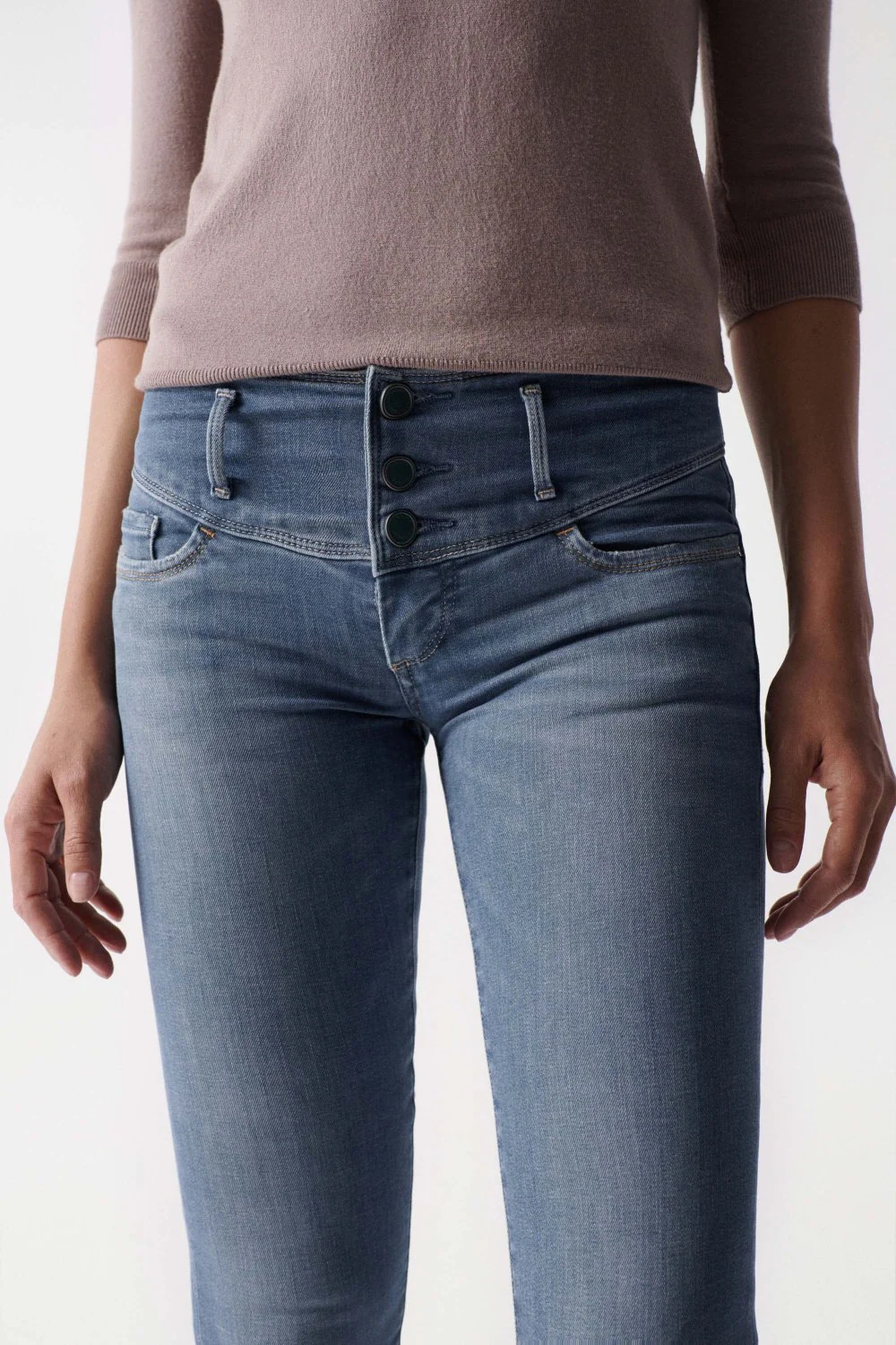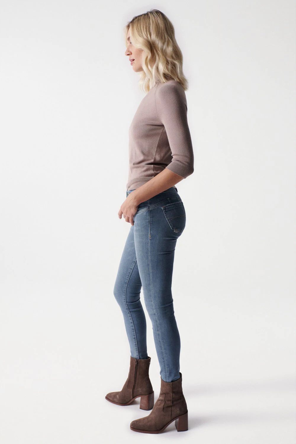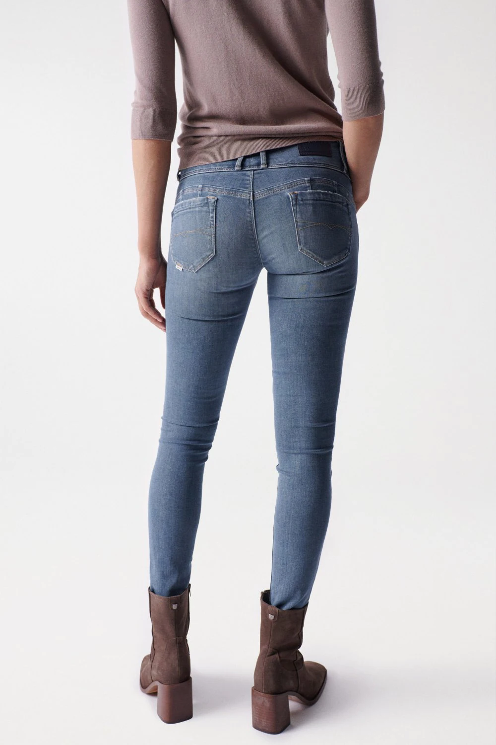 Vaqueros Mystery Push Up. Azul. Pierna Skinny. Cintura baja. Cierre de cremallera. Cinco bolsillos. Con presillas.