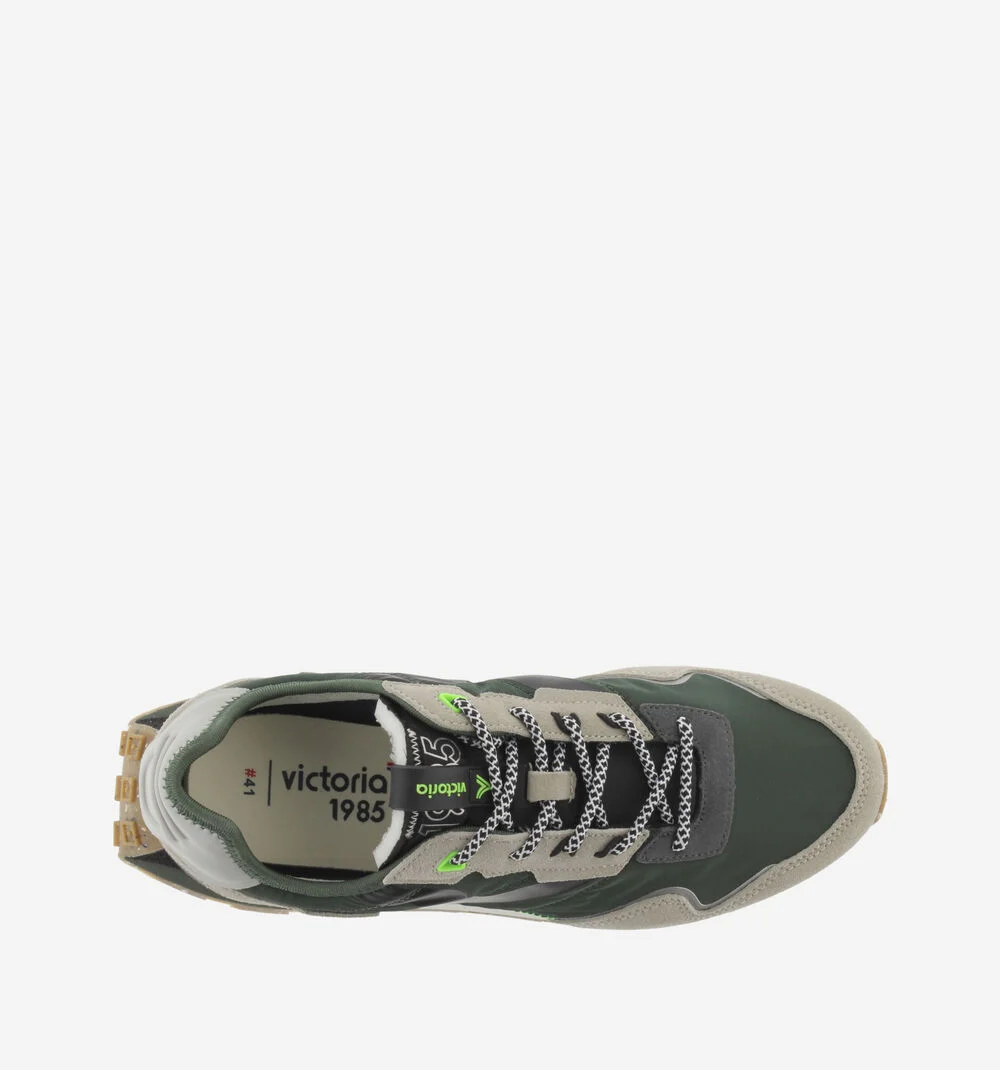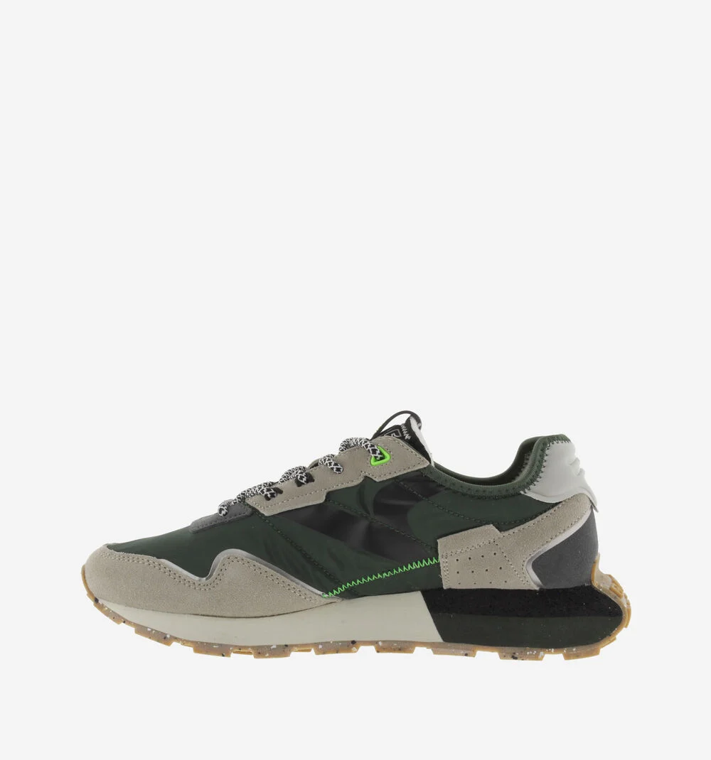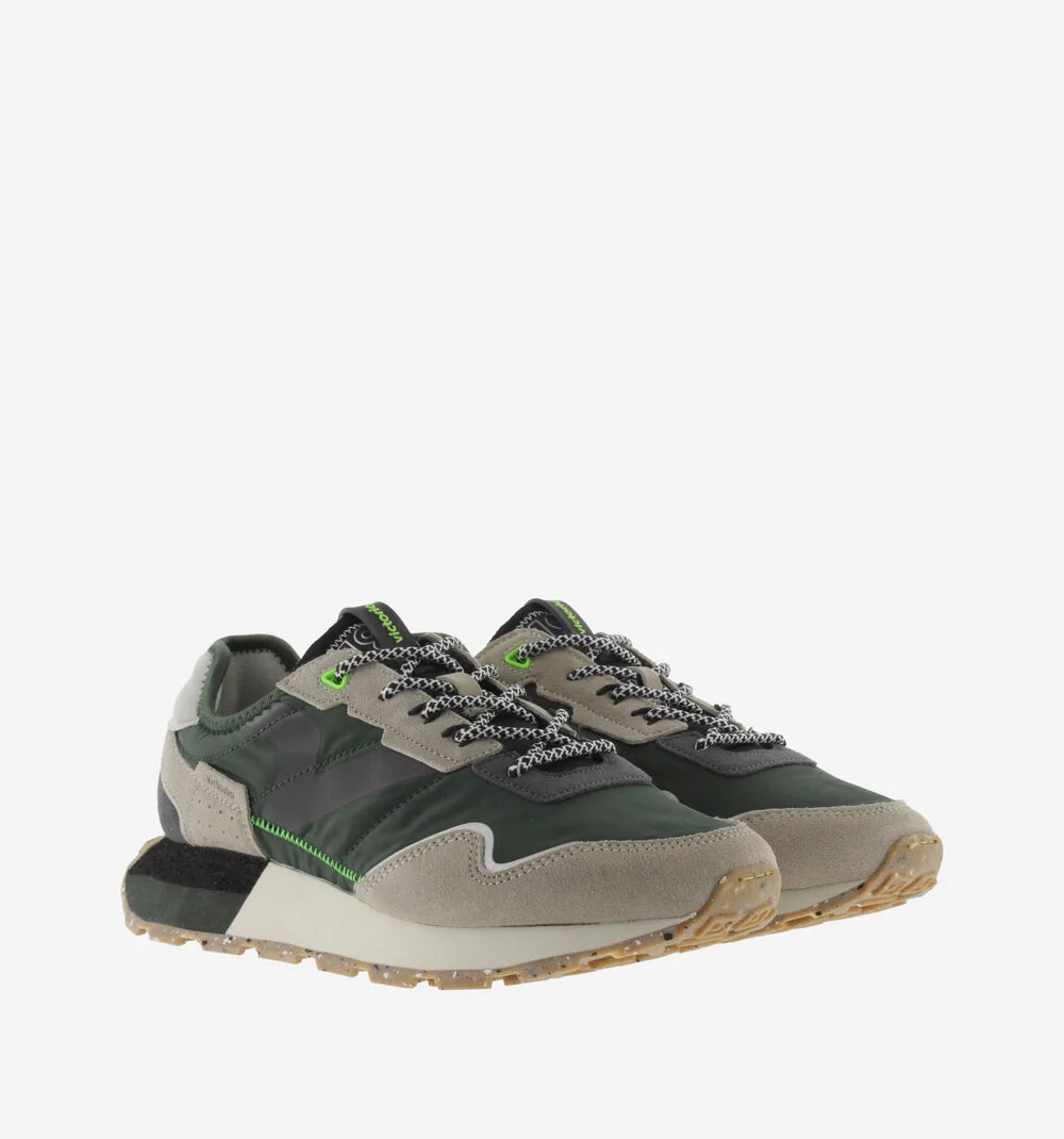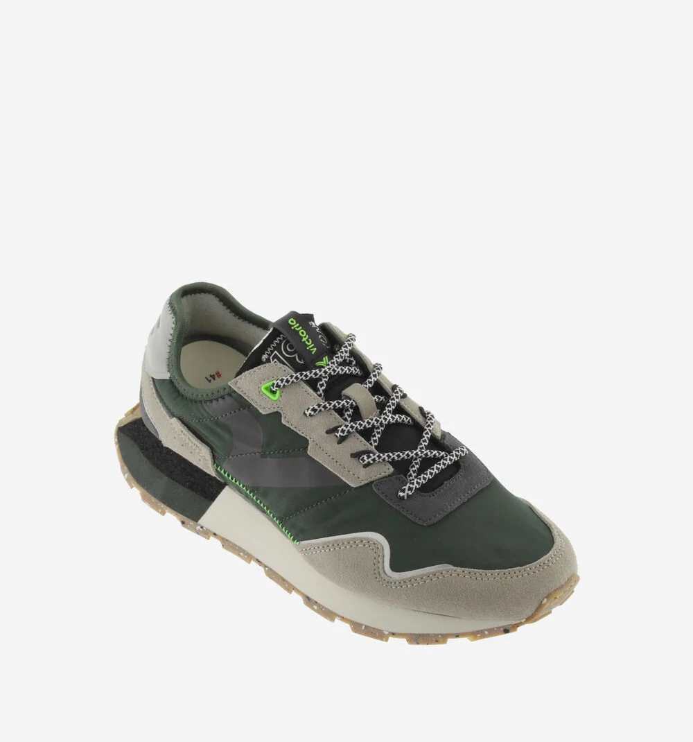 Sneakers para hombre fabricadas en nailon y piezas superpuestas en serraje. V retro en el lateral en negro al tono con la lengüeta. Pieza gris en la trasera y cierre mediante cordones redondos. Tonos verdes flúor en los cosidos de los laterales, etiqueta de la lengüeta y ojal. Suela EVA que incluye como novedad un detalle de piedra pomez. Patín de goma en relieve y estampado moteado que contiene materiales reciclados.